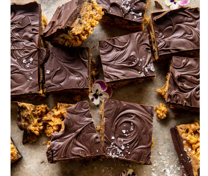 Chewy no-bake Cookie Dough Chocolate Peanut Butter Bars – the yummiest! A crisp, chewy, sweet, and peanutty cereal base topped with my homemade chocolate chip cookie dough, then a thick layer of salted chocolate. All made with simple, wholesome ingredients: organic cornflakes, honey, pure maple syrup, natural peanut butter, and dark chocolate. Cashew butter is the key to the cookie dough, chewy, salty-sweet, and just delicious.
