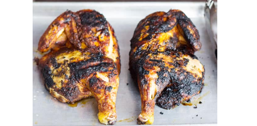 Place the chicken breast side down on a cutting board and with kitchen shears cut through the bones on both sides of the backbone. Remove and discard the backbone. Flip the chicken over and cut through the center of the breastbone.